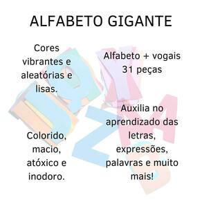 Letras gigante em eva alfabeto vogais grande 31 peças painel Alfabeto gigante + vogais 31 peças, aproximadamente 21 cm As letras gigantes de eva evamax, contêm todas as letras do alfabeto de a a z. Desenvolvidas para auxiliar no processo de alfabetização, formar palavras, frases, expressões, nomes e muito mais O eva evamax é colorido, macio, atóxico e inodoro. Indicado para maiores de 3 anos. Conteúdo da embalagem: 31 letras gigantes abc + vogais Medida da peça: 21 cm. Total de peças na embalagem: 31 peças. Espessura: 0,2 mm. Cor: , conforme fabricação. Marca: Não Informado Ean: 7899411554508