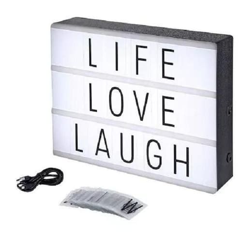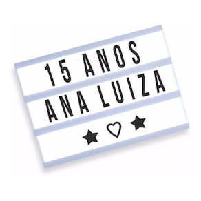 Luminária Cinema Light Box Led A5 96 Letras Números Ícones: Coloque suas mensagens pessoais no centro das atenções com esta caixa de luz. São três painéis para inserir letras, ícones ou símbolos, permitindo que você coloque a frase que você quiser ou exiba seus ícones favoritos.