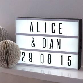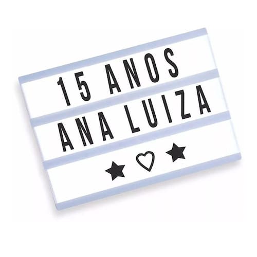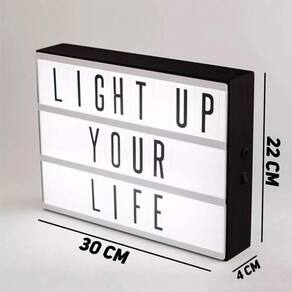 Letreiro Quadro Led Cinema 96 Letras NúmerosDescrição:Ideal para decoração de casa, quarto de bebês, festas, casamentos ou o que mais sua criatividade permitir.Você pode inserir letras, ícones ou símbolos com esta caixa de luz.Seu material e de alta durabilidade e resistência, assim garantindo vida útil ao produto.Luz de cor branca;Características :- Material de alta durabilidade e resistência;- Conexão USB;- Alimentação 4 pilhas AA(não inclusas) e cabo USB;- Possui letras, números e figuras;- Design moderno;- 96 slides;- Tamanho: 30 cm x 25 cm x 10 cmItens inclusos :- 1 painel ;- 96 caracteres;- 1 cabo usb;
