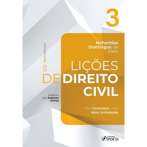 Sobre a obra Lições de Direito Civil - Volume 3 - 6 Ed - 2025 Dos Contratos e dos Atos Unilaterais Esta obra aborda todos os conceitos indispensáveis ao conhecimento básico do direito civil brasileiro. A obra não tem a pretensão de ser um tratado doutrinário, mas como o próprio nome da coleção diz, ser lições de direito civil. Cada volume apresentado estabelece premissas fundamentais para a melhor compreensão da matéria ao analisar acertadamente os institutos que tratam do conteúdo da disciplina. Destacam-se na coleção alguns traços distintivos com relação a outras obras similares disponíveis no mercado, como, por exemplo, a falta de citação de outros autores. Quer dizer, a obra é direta e objetiva e o autor não se preocupou em ficar colacionando notas de doutrina de outros autores para reforçar seus conceitos. Outro exemplo: nas citações de artigos de Lei, especialmente do Código Civil, o leitor encontrará em notas de rodapé o texto do artigo mencionado. Dessa forma, o aluno não necessitará ter ao lado o vade mecum e ficar folheando-o em busca dos artigos mencionados. Quer dizer, seus conceitos são diretos, objetivos e claros, sem repetições. Lições de Direito Civil vai contribuir para a formação de futuros operadores do direito, bem como pode ser útil àqueles que vão prestar o Exame da Ordem dos Advogados do Brasil e aos candidatos que vão prestar concursos para juízes, promotores, defensores e outros cargos destinados a advogados. A coleção completa é composta dos seguintes volumes: Vol. 1 Teoria Geral das pessoas e dos bens Prefácio Dra. Andrea Wild Vol. 2 Obrigações e Responsabilidade Civil Prefácio Dr. Paulo Hamilton Siqueira Jr Vol. 3 Dos Contratos e dos Atos Unilaterais Prefácio Dra. Roberta Densa Vol. 4 Direitos das Coisas Prefácio Dr. Carlos Alberto Garbi Vol. 5 Família e Sucessões Prefácio Dra. Adriana Galvão Moura Abílio Autor Nehemias Domingos de Melo APLICAÇÃO O livro destina-se especialmente aos alunos da graduação