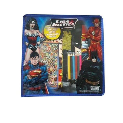 Chegou o kit pinte e brinque Liga da Justica, vem com um livro com uma corrida eletrizante para voce colorir, adesivos superlegais para colecionar, lapis de cor e uma bolsa irada.