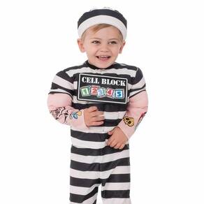 O clássico traje de prisioneiro listrado com um divertido toque de cara duro. O traje inclui camisa listrada, calças combinando e chapéu. A camisa apresenta braços acolchoados com tatuagens e impressão de bloco alfabético Cell Block na frente.