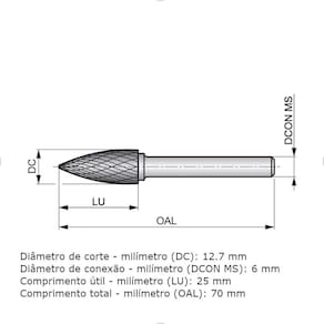 Lima tipo árvore pontiaguda (formato G), diâmetro 12.7mm com 25mm comprimento de corte, 70mm comprimento total e 6mm haste, haste de aço temperado com ponta soldada de metal duro e acabamento brilhante, canal duplo corte com espaçamento fechado das arestas (DC) para contorno multi-angular e corte de cantos estreitos em áreas com difícil acesso em aço e aço fundido, aço inoxidável, ferro fundido, cobre ou ligas de cobre, superligas termo-resistentes e materiais endurecidos Brilhante (sem revestimento). Material Duro (Metal Duro). Forma de Árvore Pontiaguda. Geometria Corte Duplo. Peso bruto: 45g Diâmetro de corte: 12.70 mm Diâmetro de conexão: 6 mm Comprimento útil: 25 mm Comprimento total: 70 mm Modelo: P81312.7X6.0 Marca: Dormer