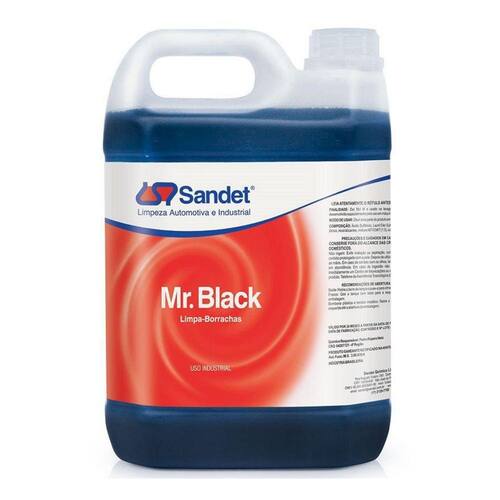Detalhes do limpa borrachas mr. Black 5 litros sandet: O mr. Black renova a cor e aparência de partes emborrachadas deixando a superfície com aspecto brilhante. Produto á base de açúcar, biodegradável e de odor agradável. Indicado para uso em pneus,tapetes, painéis e partes emborrachadas de veículos. Ph: 7,00- 8,00 Aspecto: liquido transparente Cor: preto