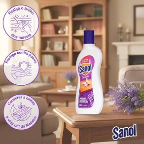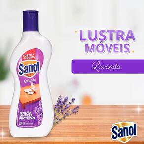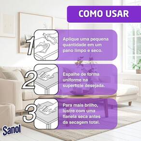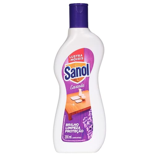 Lustra Móveis Sanol Lavanda 200ml O Lustra-Móveis Sanol limpa, protege, conserva e dá brilho aos móveis e materiais de madeira, deixando um perfume agradável por onde passa. Sua fórmula à base de cera de carnaúba e silicone reduz a aderência de poeira e manchas de umidade, deixando sobre os móveis uma fina camada protetora. Indicado para móveis e assoalhos vitrificados, móveis encerados, envernizados, laqueados e superfícies laminadas. Proporciona brilho instantaneamente através de uma aplicação fácil que não necessita de polimento. Ideal para a manutenção diária de objetos de couro ou courino.