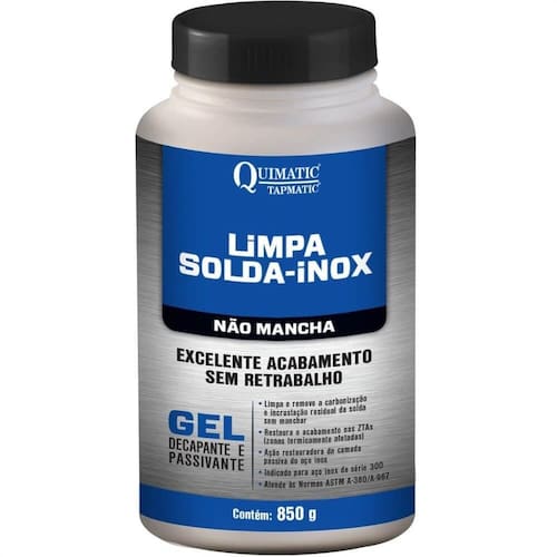 - O Limpa-Solda-Inox Não Mancha Quimatic é uma composição de substâncias desoxidantes fortes com alta tecnologia que limpa e remove eficientemente a ferrugem, manchas, sujeira, carbonização e contaminantes incrustados na operação de soldagem em inox da série 300 com um acabamento excelente. Por ser na forma de gel, não escorre e limpa eficientemente cordões de solda irregulares ou na posição vertical. Acelera o processo de auto passivação do aço inox, processo que devolve a camada superficial de proteção do aço inox.