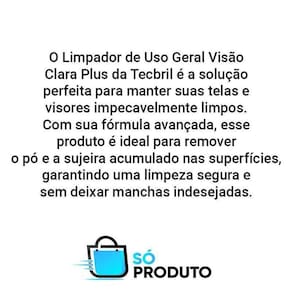 O Limpador de Uso Geral Visão Clara Plus da Tecbril é a solução perfeita para manter suas telas e visores impecavelmente limpos. Com sua fórmula avançada, esse produto é especialmente desenvolvido para remover efetivamente o pó e a sujeira que se acumulam nas superfícies, garantindo uma limpeza segura e sem deixar manchas indesejadas.