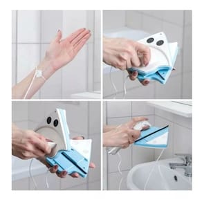 MODO DE USO: - Molhe a esponja com água e aplique a solução limpeza de sua preferência em toda a superfície do vidro para melhor deslize do aparelho - Amarre a parte usada do lado de fora com a corda segura para fins de segurança - Coloque as 2 partes em ambos os lados da janela - Mova a parte interna para limpar e a externa deve se mover também