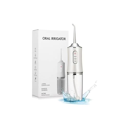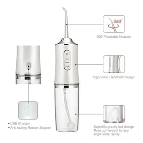 . Limpador Bucal Irrigador Dental Portátil com 4 pontos de irrigação. Ajuda com a limpeza interdental. Este irrigador oral pode reduzir eficazmente os resíduos de alimentos, germênios e a suciedad, ajudando a melhorar a condição oral.. Sistema de propulsão a frio que substitui o fio dentário. Obtenha resultados rápidos, fáceis e sem dor. Limpe suavemente a placa e limpe as superfícies difíceis de alcançar. O design ergonômico e o ponto de perfil abaixo ajudam a alcançar os dentes posteriores. Capacidade 220 ML. Material: ABS. Potência 3.5w. Peso: 250g aprox. Tensão: 5V. 3 modos diferentes de limpeza.. Desmarque o botão de ignição pressionado para alterar o modo de limpeza. APENAS 4 BOQUILLAS OU PONTOS DE IRRIGAÇÃO.