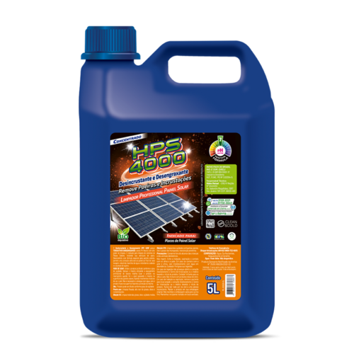 HPS 4000 é um Limpador Desincrustante e Desengraxante. Possui tensoativos biodegradáveis, sendo PH Neutro com alto poder de limpeza. É indicado para limpeza de sistemas de Painéis Solares, incluindo sua estrutura de apoio.
