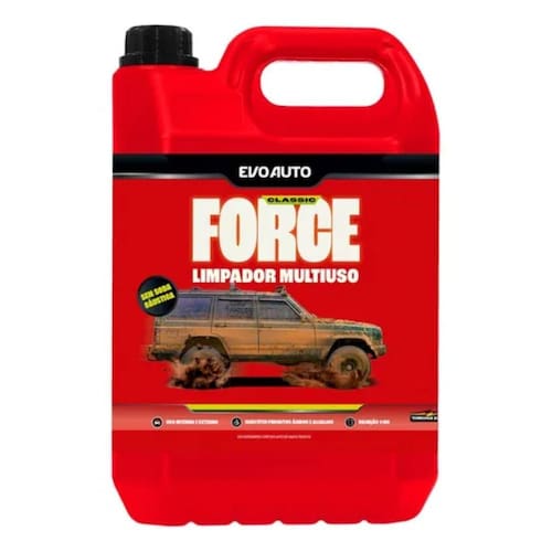 Force detergente multifunção evo auto - 5 litros O force evo auto é um apc all purpose cleaner super concentrado e versátil, ideal para limpezas leves, médias e pesadas. Sua fórmula exclusiva age contra sujidades orgânicas e minerais, combinando propriedades de shampoos ácidos, alcalinos e neutros, garantindo limpeza eficiente sem agredir as superfícies. Principais benefícios Fórmula poderosa Remove sujeiras leves, médias e pesadas com eficiência. Versatilidade Atua em resíduos orgânicos e minerais. Seguro para superfícies Não danifica pinturas ou materiais sensíveis. Alta diluição Concentração que garante economia e alto rendimento. Indicado para veículos, máquinas agrícolas, chassis e rodas A nr estetica oferece uma de 7 dias uteis Marca: Não Informado