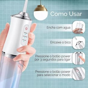 Limpador Oral Irrigador Bucal Water Dente Gengiva Bivolt Limpador Prótese Protocolo Jato D'água Elétrico Fixa Móvel Bivolt O irrigador oral foi desenvolvido para alcançar e higienizar locais que a escova e o fio dental não alcançam. É ótimo e recomendado principalmente a quem usa , implantes, próteses e outros procedimentos, e não consegue tirar melhor proveito do fio. Além disso, é capaz de remover restos de alimentos entre os dentes, o que ajuda a evitar placa bacteriana e possíveis cáries. Inibi o tom amarelado dos dentes e estimula a corrente sanguínea na gengiva, mantendo-a saudável. Benefícios e Diferenciais: - Quatro Bicos Intercambiáveis: Inclui diferentes bicos que permitem uma limpeza abrangente de todas as áreas da boca, adaptando-se às suas necessidades específicas. - Chip Inteligente Integrado: Proporciona controle preciso da pressão da água, garantindo uma experiência de limpeza confortável e personalizada. - Fluxo de Água Extrafino de 0,6 mm: Remove resíduos com precisão, alcançando áreas difíceis e proporcionando uma limpeza eficaz. - Indicado para Usuários de , Implantes ou Coroas: Facilita a higienização de estruturas dentárias especiais, assegurando uma limpeza adequada e segura. - Bateria Recarregável de Longa Duração: Com uma carga completa, o irrigador pode ser utilizado por até 21 dias, tornando-o perfeito para viagens e uso diário. - Três Modos de Jato: Oferece opções de jato fraco, forte e pulsante, permitindo que você escolha a intensidade ideal para cada situação de limpeza. Modo de Uso: 1. Carregue o aparelho por aproximadamente quatro horas antes do primeiro uso. 2. Encha o reservatório com água limpa. 3. Pressione o botão Power por três segundos para ligar ou desligar o dispositivo. 4. Pressione rapidamente o botão Power para alternar entre os modos: - Jato Fraco: Ideal para limpeza superficial e massagem gengival. - Jato Forte: Eficaz na remoção de resíduos mais difíceis. - Jato Pulsante: Proporciona uma massagem suave nas gengivas. 5. Inicie a limpeza pelos dentes posteriores, direcionando o jato de água para alcançar dentes e gengivas. Especificações: Material: ABS, PC Saída: 3.7V 5W À prova d'água: IPX7 Tamanho: 28,35CM Tanque de Água: Tanque Destacável 220ml Frequência de pulso: 1200 vezes/Min Faixa de Água: 30-110 PSI Carregamento: Carregamento USB Tipo de Bateria: Bateria de Lítio 1000mAh Recarregável Conteúdo da Embalagem: - 1 Irrigador Oral - 4 Bicos Intercambiáveis - 1 Cabo USB para Carregamento - Manual de Instruções