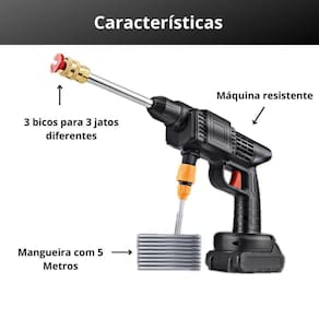 tempo de carga: 3 horas primeira carga por 12h ; tempo de uso até 1 hora; tamanho da mangueira de acoplar: 5 metros; bocal de metal de alta pressão; com níveis de pressão: desde lavar carros até regar plantas; carga de fluxo de agua: 4 litros/min.