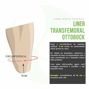 Detalhe Técnico: Nível de Amputação: Transfemoral. Silicone: Silicone macio em combinação com estabilidade de tecidos moles. Com conexão. Possui Cobertura externa. Medir a circunferência do coto de 5 cm acima da extremidade distal do membro residual e selecionar o tamanho do forro que corresponde a esta medição. Tamanhos Circunferência Distal: 280, 300, 320, 340, 360, 380, 400, 420, 450, 500 e 550mm. Espessura da parede - Base: 14mm, Inicio Lateral: 4,5mm, Final Lateral: 2,5mm.