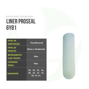 Descrição Comercial: O Liner de silicone 6Y81 ProSeal proporciona um encaixe estável, boa conexão e facilidade de uso para conexões transfemorais com sistema de suspenção à vácuo. Espessura de parede de 3 mm. Superfície externa antiaderente para facilitar a entrada no encaixe. Superfície interna sedosa e texturizada para melhor conexão e maior conforto. Durável e fácil de limpar. Fácil de vestir e tirar. Para amputados acima do joelho com níveis moderados a altos de atividade. Funciona com o sistema de anel ProSeal.
