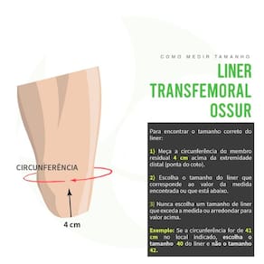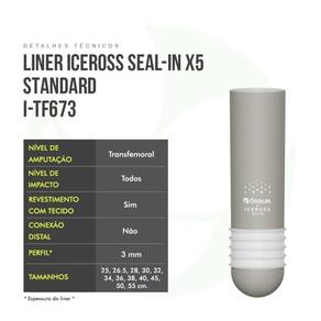 Descrição Comercial: O Liner Transfemoral Standard Iceross Seal-In® X5 – Ossur oferece segurança e liberdade de movimento sem compromissos para amputados transfemorais com nível de atividade baixa a extremamente ativos. Agora, com um novo revestimento têxtil que melhorou a aderência em 25%, a cobertura do tecido é extremamente durável e permite flexibilidade e elasticidade. Estes são os níveis de impacto que o Liner Iceross X5 suporta: Baixo - Atividades diárias envolvendo andar suave e constante com o uso de um auxílio para caminhar. Exemplo: Movendo-se em casa, caminhando modestamente na comunidade. Moderado - Atividades diárias envolvendo caminhada média com a habilidade de variar velocidade ou padrão de caminhada. Exemplo: Ir às lojas, andar ao ar livre confiante. Alto - Atividades diárias envolvendo caminhada rápida, corrida e subir escadas. Exemplo: trabalho pesado, trabalho manual, esportes recreativos. Extremo - Atividades envolvendo corrida, pista e campo, corrida e corrida de longa distância. Exemplo: esportes de pista e campo. Por que Padrão ou Cônico? O coto pode ter variações de tamanho e formato, alguns mais finos, outros mais grossos, obedecendo a fisiologia do usuário do liner. Pensando nestas variações, temos os tamanhos: Padrão - Liner com formato mais comum, com uma circunferência mais baixa a média.