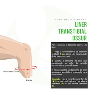 Aplicação e Modo de Usar: Como saber meu tamanho? Para saber qual seria o seu tamanho para utilizar o liner Iceross Comfort com conexão você irá precisar de uma fita métrica e seguir este passo a passo: Meça a circunferência do coto do membro amputado, 4 cm acima da extremidade distal. Escolha o tamanho de Iceross correspondente à medida obtida ou o tamanho imediatamente inferior à medida obtida. Nunca use um tamanho de liner acima da medida obtida, nem arredonde esta por excesso.