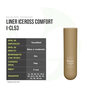 Descrição Comercial: O Iceross Comfort é um liner excepcional para cotos com protuberâncias ósseas propensos a picos de pressão e/ou para cotos cônicos. A cobertura externa oferece resistência extrema ao desgaste e durabilidade enquanto que permite alongamento radial e elasticidade confortável. O Iceross Comfort Cushion é projetado com o silicone Sensilº da Ossur e uma cobertura de tecido de nylon. Quais os níveis de impacto que encontro no Iceross Comfort sem conexão Ossur? Os níveis seriam Baixo para atividades diárias envolvendo caminhadas suaves e estáveis, com uso de apoio ao caminhar, como mover-se pela casa, caminhadas pequenas na rua, etc., Moderado para atividades diárias envolvendo caminhadas variadas em velocidades diferentes e tipos diferentes, como ir ao shopping, caminhadas seguras na rua, etc.