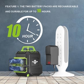 - Modo autonivelante e manual – Com o interruptor para o lado "desbloqueio", a ferramenta está no modo autonivelante, o que significa que a ferramenta se nivelará sozinha se estiver dentro de ± 4° da horizontal. Se a superfície inclinar mais de 4 graus, se a superfície inclinar mais de 4 graus, o laser piscará como um alarme; deslize o interruptor para o lado "LOCK" e pressione o botão por 3 segundos para ligar o laser no modo manual, o recurso de autonivelamento será desativado e trave as linhas para alinhamento em qualquer ângulo.
