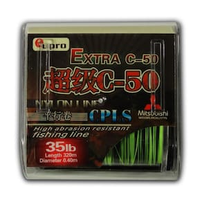 Linha de Pesca Monofilamento Eupro - Extra C-50 Tamanho: 35lb - 0.40mm - 320m Linha de Pesca Monofilamento Eupro - Extra C-50 Linha de monofilamento de alta tecnologia fabricada pela empresa Japonesa Mitsubishi. Possui baixo coeficiente de memória. Indicada para pesca marítima. Indispensável na sua pescaria. 15 - Incluso: 1 peça - Comprimento: 550 metros - Diâmetro: 0.28mm - Resistência: 15lb ou 6,8kg. - Cor : Verde e Preto 25 - Incluso: 1 peça - Comprimento: 450 metros - Diâmetro: 0.33mm - Resistência: 25lb ou 11kg. - Cor : Verde e Preto 30 - Incluso: 1 peça - Comprimento: 350 metros - Diâmetro: 0.37mm - Resistência: 30lb ou 13kg. - Cor : Verde e Preto 35 - Incluso: 1 peça - Comprimento: 320 metros - Diâmetro: 0.40mm - Resistência: 35lb ou 16kg. - Cor : Verde e Preto Origem: China Marca: Não Informado