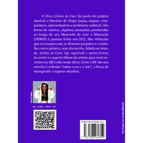 O livro Linhas de Cura faz parte do projeto musical e literário de Negra Jaque, rapper, compositora, apresentadora e produtora cultural. São letras de música, algumas pesquisas produzidas ao longo de seu Mestrado de Arte e Educação (UFRGS) e poesias feitas em 2022. São vivências que se cruzam com os diversos projetos e o trabalho com a palavra, seja ela escrita, falada ou rimada. Linhas de Cura: rap, negritude e outras formas de existir é o quarto álbum da artista (que você encontra no QR Code nesta obra). Livro e EP são um convite à reflexão “sobre o eu e o nós”, a força de transgredir e superar desafios. A cultura hip hop por si só é protagonista no diálogo com a juventude. Há 50 anos, influencia gerações e está presente em vários campos, entre eles o cultural, político, econômico e educacional. Após séculos de violência e ausência, é fundamentalmente decisivo que as maiorias minorizadas sejam narradoras de suas próprias histórias. Pesquisar sobre a cultura hip hop, um movimento prioritariamente negro e diaspórico, representa o produto dos saberes emancipatórios iniciados e orquestrados pelo Movimento Negro, entendedor da importância do discurso e de um potente lugar de fala. Negra Jaque coordena o Galpão Cultural – Casa de Hip Hop em Porto Alegre e atua na rede nacional Nação Hip Hop Brasil. “Essa é a arte de operários, criadores em territórios áridos, do barro vermelho e da vontade de buscar um cotidiano melhor.” Produtora do Bloco das Pretas, Negra Jaque integra o time de pesquisadores do primeiro Museu da Cultura Hip Hop do RS, primeiro da América Latina. Em Linhas de Cura, aborda questões que envolvem ser mulher no Brasil e, acima de tudo, ser uma mulher preta. Também, a prática antirracista encontra no rap um portal de diálogo para a mudança. “Não se conformar é a ordem do dia, e de todos os dias de uma grande parcela de invisíveis que o Brasil teima em esconder.”