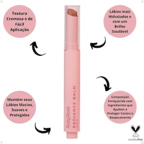 O Lip Balm Ruby Rose Radiance Balm RB20 HB-L6501-2 é um bálsamo labial nutritivo e hidratante, ideal para manter seus lábios macios, suaves e protegidos durante o dia todo. Sua fórmula avançada foi especialmente desenvolvida para oferecer hidratação intensa, proporcionando um toque de conforto imediato para lábios ressecados ou danificados.