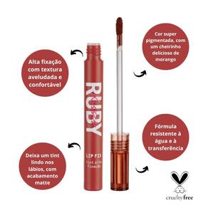 O Lip Fix Tint possui alta fixação, textura aveludada e confortável, com acabamento matte, deixando um tint lindo nos lábios. Com cor super pigmentada, possui também um cheirinho delicioso de morango, além de ter fórmula resistente à água e à transferência. Fórmula vegana e livre de crueldade animal.