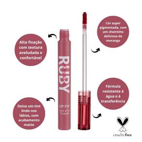 O Lip Fix Tint possui alta fixação, textura aveludada e confortável, com acabamento matte, deixando um tint lindo nos lábios. Com cor super pigmentada, possui também um cheirinho delicioso de morango, além de ter fórmula resistente à água e à transferência. Fórmula vegana e livre de crueldade animal.