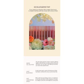 1. Se você aplicar nos lábios com um primeiro toque aquoso, ele cria um lábio macio com menos manchas com um acabamento desfocado. 2. Tinta de água borrada 3CE; se você aplicar como uma mancha nos lábios com um primeiro toque aquoso, ele cria um lábio macio com menos manchas com um acabamento desfocado. 3. Solução de gel de água; o gel de água suave que contém umidade adere levemente aos lábios como uma mancha, dando um acabamento sedoso e macio | Você pode sentir uma nova sensação de uso que nunca experimentou. 4. Acabamento azul claro; um gel primer leve é utilizado para preencher os lábios como se tivessem sido corrigido para um lábio desfocado e suave. 5. Macio e confortável: com uma sensação macia e aconchegante, não há aderência nos lábios, e há pequenas manchas nos lábios, por isso o mantém macio e confortável por um longo tempo.