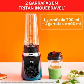 Arno Blend Up é o liquidificador compacto ideal pra quem busca o resultado perfeito para suas melhores receitas, com a máxima praticidade e alto desempenho. Motor super potente com 1000W e a exclusiva tecnologia Powelix, ele oferece desempenho até 3x mais eficiente. Possui 8 programas automáticos, para preparar leite vegetal, suco, molho cremoso, molho, sopa, triturar gelo, além do modo silencioso e auto limpeza. Acompanha 2 garrafas inquebráveis de Tritan*, de 400ml e 700ml, perfeitas para levar na mochila, para a academia, trabalho ou onde você estiver e beber direto no copo. Ele também conta com lâminas removíveis, modo de limpeza automática e escova inclusa, que tornam a higienização muito mais prática no dia a dia. Além disso, o produto é integrado ao app da Arno, com mais de 100 receitas saudáveis para inspirar sua rotina e facilitar seus preparos. Com design compacto e funcional, o Arno Blend Up é a solução ideal para quem busca uma alimentação equilibrada, com agilidade, eficiência e praticidade todos os dias.