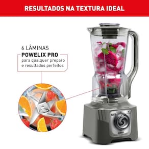 6 lâminas Powelix Pro, o liquidificador tritura os alimentos com mais facilidade, garantindo resultados com textura ideal, mesmo nas receitas mais difíceis.