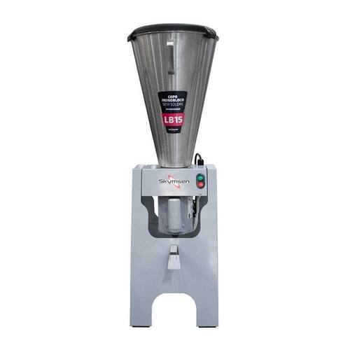 Liquidificador Basculante 15 Litros Inox Copo Monobloco Lb15 220v - Skymsen DESCRIÇÃO DO PRODUTO: - Liquidificador de baixa rotação; - Copo monobloco formato em V que permite a formação de um grande vórtice que direciona o alimento para as lâminas, sem soldas ou frestas que impede o acúmulo de resíduos; - Tampa Monitorada: Sistema de monitoramento com sensor magnético, que desliga o motor automaticamente ao abrir a tampa; - Cavalete com movimento basculante para descarga; - Motor de 1,5 CV de potência; - Rotação de 3.500 rpm; - Tampa de borracha atóxica com dosador; - Cavalete de aço e design diferenciado; - Sistema de vedação dupla; - Eixo com rolamentos; - Produzidos em conformidade com as especificações da norma NR-12 e do INMETRO.