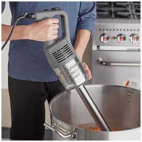 Liquidificador de imersão industrial com 18 velocidades variáveis, motor de 1,095 CV e 720W, capaz de atingir até 10.000 RPM. Haste de 45,72 cm. Ideal para processar até 100 litros. Sistema de autorregulação de velocidade. Empunhadura ergonômica. Lâmina e sino em aço inoxidável. Caixa de engrenagens em metal.Acompanha copo
