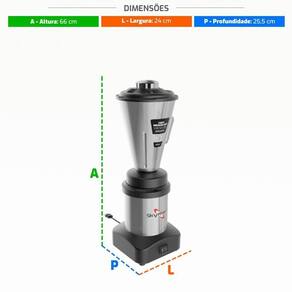 As dimensões do Liquidificador L3 são 660 mm (altura) x 240 mm (largura) x 255 mm (profundidade).