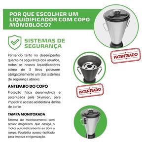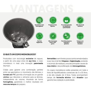 Características Técnicas: Potência 0,5CV Consumo 0,67 kWh Copo monobloco sem soldas Fácil Limpeza Gabinete e copo em aço inox escovado Fácil limpeza Perfeita vedação na tampa Sistema de encaixe sextavado do eixo Rotação de 3500 rpm Copos intercambiáveis Tampa de borracha atóxica com dosador Eixo e acoplamento metálicos
