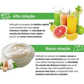 Alta Rotação: Indicada para a preparação de sucos naturais com gelo ou polpas de frutas, vitaminas e shakes Baixa Rotação: Indicada para o processamento de ingredientes mais densos, nos quais é necessária mais força e menos velocidade, tais como massas de bolo, maionese, açaí, feijão, sopas, molhos, cremes, entre outros