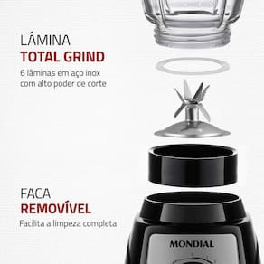 LÂMINA TOTAL GRIND: São 6 lâminas em aço inox, sendo duas serrilhadas, com alto poder de corte, super-resistentes e eficientes. A lâmina em inox também é mais durável e não enferruja.
