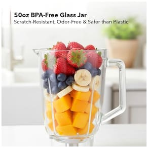 A jarra em vidro proporciona maior resistência a riscos e odores em comparação a plásticos, trazendo mais higiene no uso contínuo, além de contar com tampa com copo medidor integrado para facilitar o acréscimo de líquidos e outros ingredientes durante o preparo. Os pés antiderrapantes na base aumentam a estabilidade sobre a bancada, reduzindo vibrações e deslocamentos durante a trituração de gelo e alimentos mais duros.