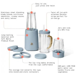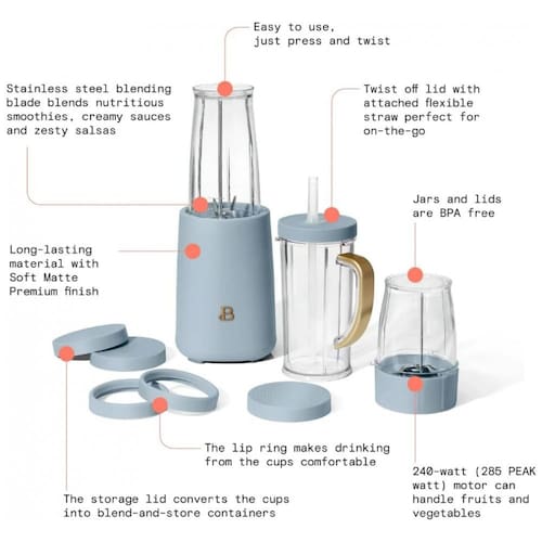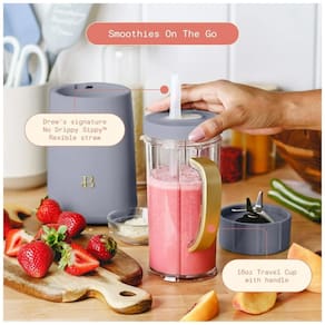Liquidificador pessoal compacto de 240W da linha Beautiful by Drew Barrymore, com acabamento branco fosco e sistema de copos para preparo direto e consumo imediato de bebidas e receitas em pequenas porções. Utiliza conjunto de lâminas em aço inox para mistura e trituração, indicado para smoothies individuais, pequenos molhos, preparo de alimentos em porções reduzidas e moagem de café e temperos secos. ? O kit inclui base com motor, copos de diferentes capacidades, tampa de viagem com alça e canudo com sistema anti-pingos, além de tampas para armazenamento e anéis de acabamento para beber diretamente no copo. Os recipientes são produzidos em material livre de BPA, compatíveis com lava-louças na prateleira superior, enquanto a base é acionada por giro, facilitando o uso em bancadas compactas.