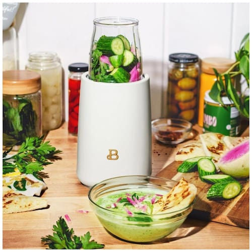 Liquidificador pessoal compacto de 240W da linha Beautiful by Drew Barrymore, com acabamento branco fosco e sistema de copos para preparo direto e consumo imediato de bebidas e receitas em pequenas porções. Utiliza conjunto de lâminas em aço inox para mistura e trituração, indicado para smoothies individuais, pequenos molhos, preparo de alimentos em porções reduzidas e moagem de café e temperos secos. ? O kit inclui base com motor, copos de diferentes capacidades, tampa de viagem com alça e canudo com sistema anti-pingos, além de tampas para armazenamento e anéis de acabamento para beber diretamente no copo. Os recipientes são produzidos em material livre de BPA, compatíveis com lava-louças na prateleira superior, enquanto a base é acionada por giro, facilitando o uso em bancadas compactas.