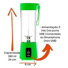 Especificações: - Capacidade: 380 ml - Modelo do motor: 3,6 Vdc - Rotação do motor: Sem carga: 22000 RPM / Carga: 15000 RPM - Corrente de trabalho: 10-12 A - Bateria: 3,7 Vdc - Capacidade da bateria: 2000mAh - Alimentação: 5 Vdc via porta USB Conectado ao Smartphone mini USB - Tempo de recarga: 3 horas aproximadamente - Único tempo de trabalho: 90 s - Proteção ociosa: Desliga em 5 s - Carga completa usando tempos: 10-12 vezes - Material da lâmina de corte: SUS304