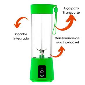 Características: - Possui bateria interna recarregável de longa duração, para que você possa utilizar o liquidificador por mais tempo. - O motor de alta velocidade faz um copo de suco em menos de um minuto, agilizando o preparo das suas bebidas. - Com 6 lâminas 3D, o liquidificador garante máxima eficiência na mistura de diferentes frutas e legumes. - Possui coador integrado e alça de transporte, facilitando o uso e o transporte do produto. - Pode ser utilizado como um copo comum ou como liquidificador, oferecendo versatilidade para o seu dia a dia. - Conta com dupla proteção de segurança e proteção de carga/descarga, garantindo a sua segurança durante o uso. - Pode ser recarregado através de porta USB, carregador de celular, powerbank ou conectado ao seu Smartphone.