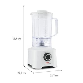 A jarra em San Cristal possui capacidade total de 3,1 litros, ideal para preparar grandes quantidades de sucos, sopas, vitaminas, molhos e diversas receitas para toda a família. O corpo em plástico resistente proporciona durabilidade e fácil limpeza, enquanto o porta-fios integrado mantém o ambiente organizado. O modelo possui cabo de 75 cm, permitindo maior flexibilidade no uso.