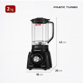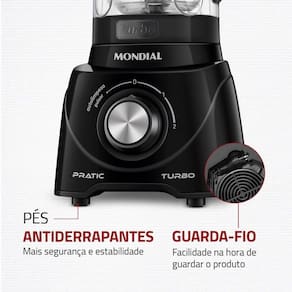 Copo resistente: O copo do liquidificador Pratic Turbo é feito de San Cristal, material resistente a quedas e riscos, supertransparente e que não pega cheiro ou cor.