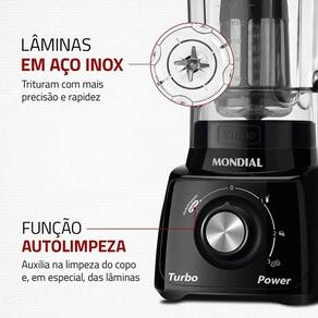 Design moderno e muita praticidade em sua rotina na cozinha. O liquidificador Mondial Turbo Power L-99-FB tem 2,2 litros de capacidade total, 550W de potência e vem acompanhado de filtro em inox, para coar sucos e molhos. Você pode preparar torta de frango, bolo de milho, pão de queijo, massa de panqueca, queijadinha e muitas outras receitas com agilidade. Saiba mais sobre o L-99-FB: POTÊNCIA: 550W Permite que você misture ou triture suas receitas com maior agilidade. CAPACIDADE* TOTAL: 2,2 LITROS Prepare sucos, vitaminas, smoothies, molhos e diversos outros pratos na porção ideal que você precisa! *Capacidade Útil de 1,6 Litros. LÂMINAS EM INOX Trituram com mais precisão e rapidez. Além disso, não enferrujam e são mais duráveis. JARRA RESISTENTE: O copo do liquidificador Mondial é feito de San Cristal, material resistente a quedas e riscos, supertransparente e que não pega cheiro ou cor. COM FILTRO O filtro em Inox permite que sucos e molhos fiquem prontos sem semente ou bagaço. E sem precisar coar! SISTEMA DE ENCAIXE RÁPIDO Encaixe seguro e fácil do copo. 3 VELOCIDADES + PULSAR Escolha a velocidade ideal para alcançar a textura perfeita! Dica: a função Pulsar tritura ingredientes mais duros. FUNÇÃO AUTOLIMPEZA Higienização rápida e prática do seu liquidificador. TAMPA COM COPO DOSADOR Facilita a adição de ingredientes durante o preparo. JARRA: BPA FREE + SEM CHEIRO O material não contém Bisfenol-A, que é nocivo à saúde, e não deixa cheiro. Aviso legal - Livre de BPA.