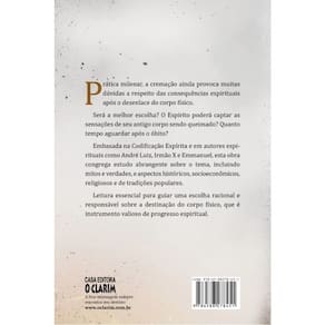 Prática milenar, a cremação ainda provoca muitas dúvidas a respeito das consequências espirituais após o desenlace do corpo físico. Será a melhor escolha? O Espírito poderá captar as sensações de seu antigo corpo sendo queimado? Quanto tempo aguardar após o óbito? Embasada na Codificação Espírita e em autores espirituais como André Luiz, Irmão X e Emmanuel, esta obra congrega estudo abrangente sobre o tema, incluindo mitos e verdades, e aspectos históricos, socioeconômicos, religiosos e de tradições populares. Leitura essencial para guiar uma escolha racional e responsável sobre a destinação do corpo físico, que é instrumento valioso de progresso espiritual.