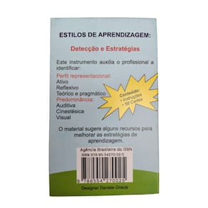 Baralho Estilos De Aprendizagem Caixa com 58 cartas formas de baralho Detecção e Estratégias Este instrumento auxilia o profissional a identificar: Perfil Representacional: Ativo Reflexivo Teórico e Pragmático Predominância: Auditiva Cinestésica. Visual O material sugere alguns recursos para melhorar as estratégias de aprendizagem. Material em papel Marca: Casa Do Psicopedagogo
