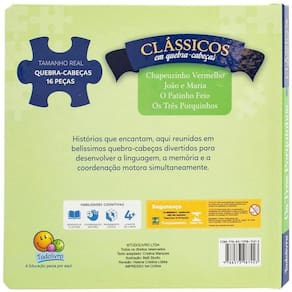 Histórias que encantam as crianças estão aqui reunidas em belíssimos quebra-cabeças divertidos que, além de auxiliar na linguagem e leitura,entretêm e desenvolvem memória e coordenação motora simultaneamente.