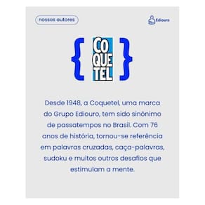 Relaxe, descubra e divirta-se: seu momento de bem-estar com o Caça-Palavras Ouro 96 páginas Nível fácil Passatempos com temáticas diversas: curiosidades, culinária, natureza, história, saúde, cultura e muito mais Ideal para iniciantes, adultos e idosos que buscam lazer, estímulo mental leve e uma pausa das telas O Caça-Palavras Ouro é uma edição pensada para proporcionar momentos de prazer, relaxamento e estímulo leve da mente. Com 96 páginas de passatempos acessíveis, este volume traz uma seleção de jogos temáticos com base em textos informativos e divertidos sobre história, culinária, saúde, natureza, música e curiosidades culturais. Cada caça-palavras é acompanhado por um conteúdo editorial que instrui, entretém e guia o desafio. Indicado para leitores de todas as idades, especialmente adultos e idosos que desejam manter a mente ativa, reduzir o desconforto e exercitar a atenção de forma prazerosa e sem pressão. Com a curadoria editorial da Coquetel, marca sinônimo de qualidade e tradição, esta publicação é perfeita para quem busca bem-estar com todas as letras. Marca: Não Informado