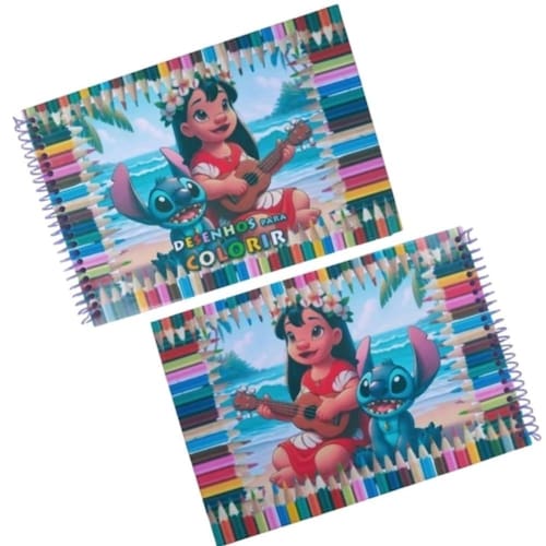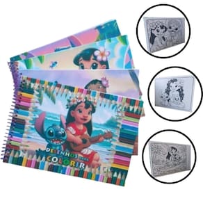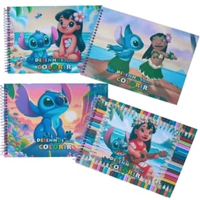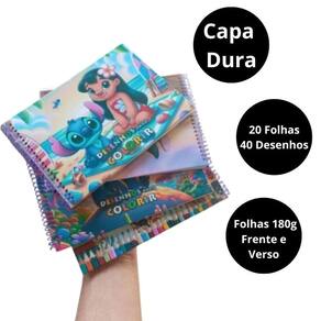 Tema: Stitch Capa: Dura e resistente Número de Desenhos: 40 (frente e verso) Número de Folhas: 20 Gramatura do Papel: 180g (alta qualidade) Tamanho do Livro: 22cm x 15cm Encadernação: Espiral de 12mm